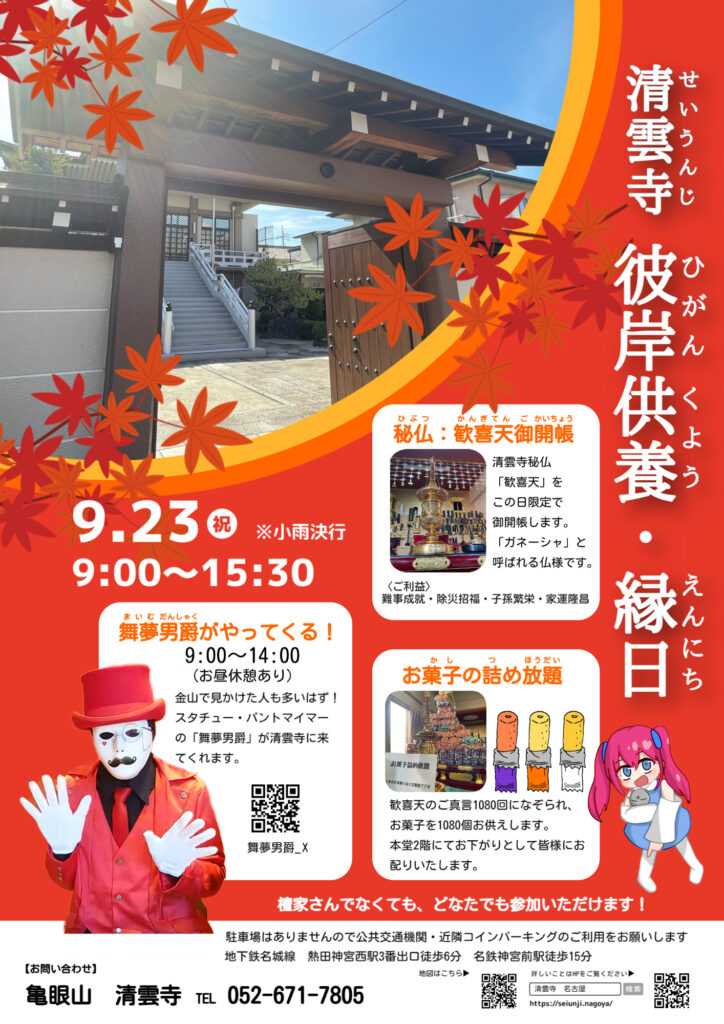 例年9月23日は千種区平和公園内にて墓前回向のお参りを行っておりましたが、2024年より清雲寺本堂にて彼岸先祖回向の法要を行いました。法要の内容は墓前回向と同等になります。